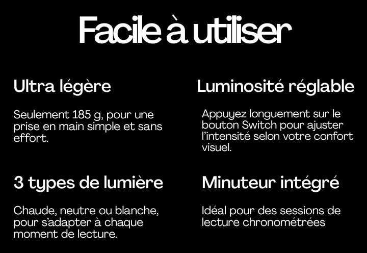 La lampe est équipée de 3 modes de couleur (chaude, neutre, blanche) et de 6 niveaux de luminosité réglables. Cela permet d’adapter la lumière à vos préférences et à l’environnement, réduisant ainsi la fatigue oculaire même pendant de longues sessions de lecture.